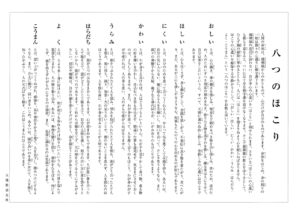 自分用に八つのほこり(拝読用)をテキスト化しました。全文を載せています。八つのほこり人間の身体は、親神様からのかりもので、心だけが自分のものであります。身体をはじめ、身の周りの一切は銘々の心通りに御守護下さいます。親神様の思召に沿わない、自分中心の心遣いを「ほこり」と仰せられます。ささいな「ほこり」の心遣いも積もり重なると、ついには十分な御守護を頂けなくなります。そこで親神様の教えをほうきとして、